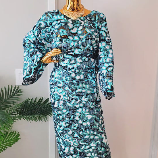 Step into any celebration with confidence wearing this show-stopping lace set. The rich turquoise tones and intricate patterns honor African tradition while delivering contemporary sophistication. Pair with statement jewelry and elegant heels for an unforgettable look.
